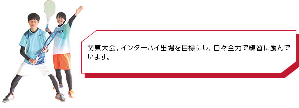 | コメント | 男子:インターハイ出場を目標に,一日一日の練習を大切にしてチーム一丸となって頑張っています。 女子:関東大会・インターハイ出場を目標に,日々笑顔で活動しています。みなさんに良い結果を報告できるよう全力で頑張りますので,応援よろしくお願いします。 |