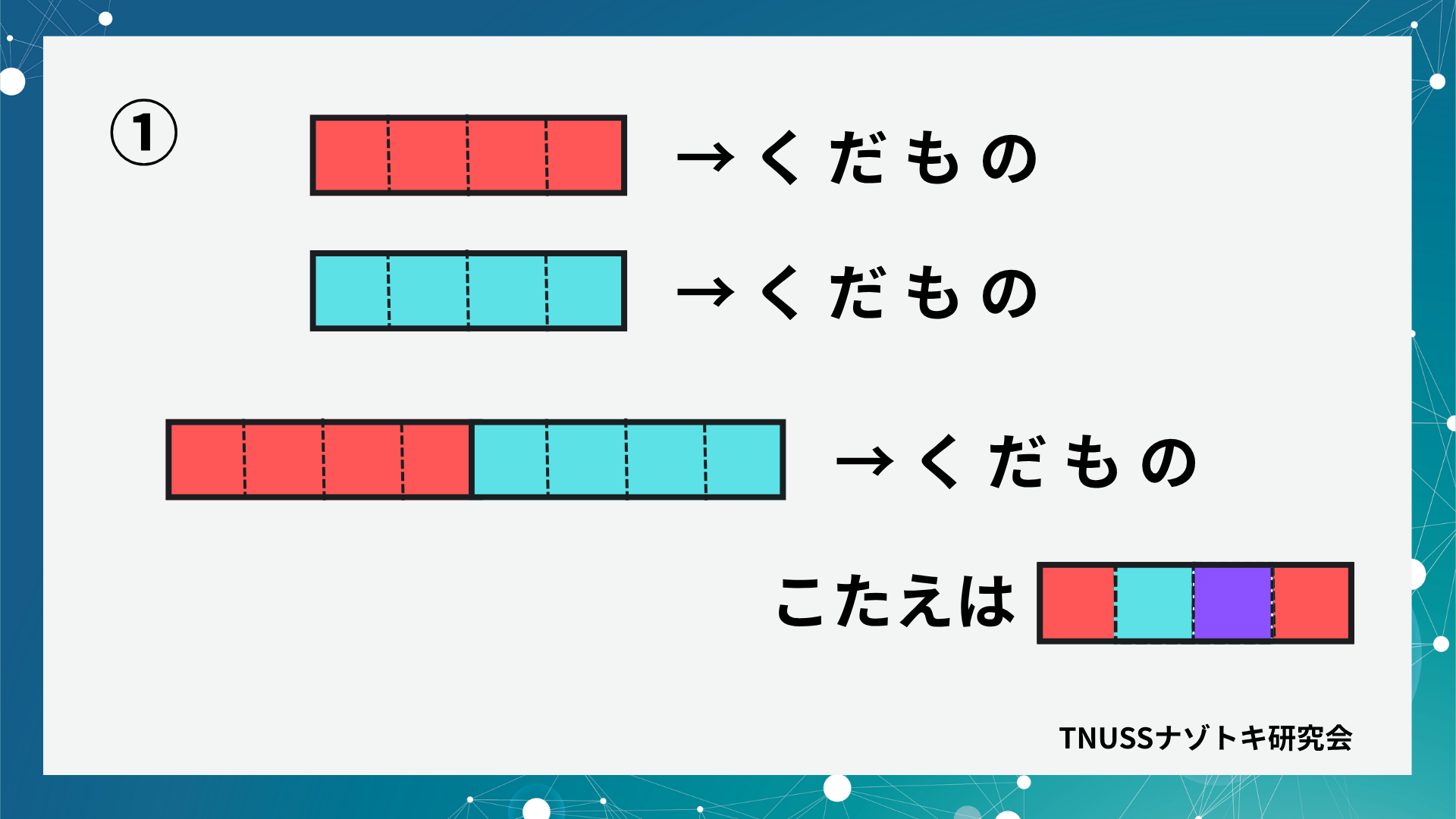 「くだものの種類」と「くだもの自体の総称」を同じ矢印で表現してよいのか悩みました。また,紫色にするなら,カタカナを2つ組み合わせて別のカタカナになるものを見つけられると面白いな...と思いましたが,諦めました。 記念すべき第1回の問題はいかがでしたか?