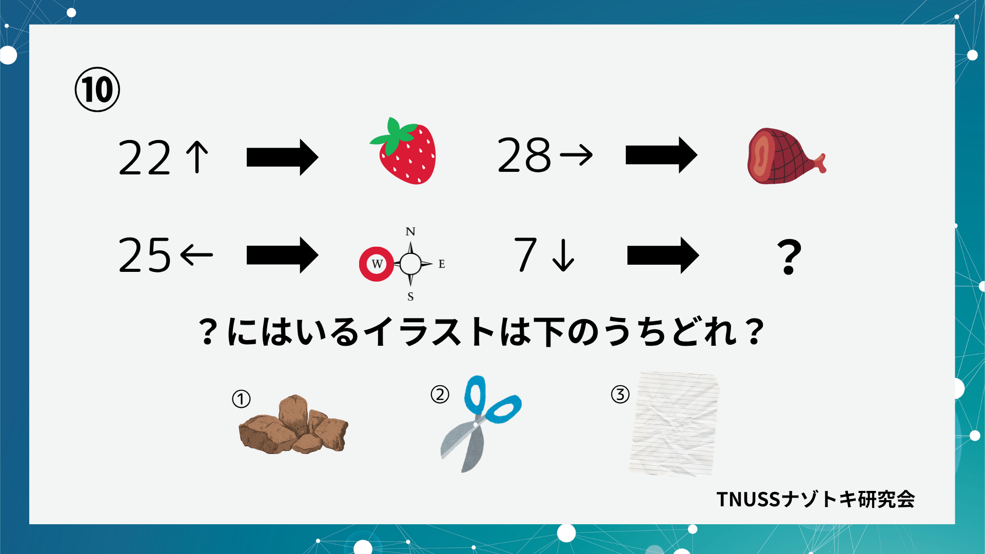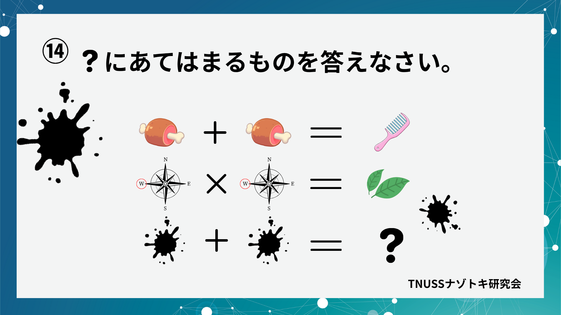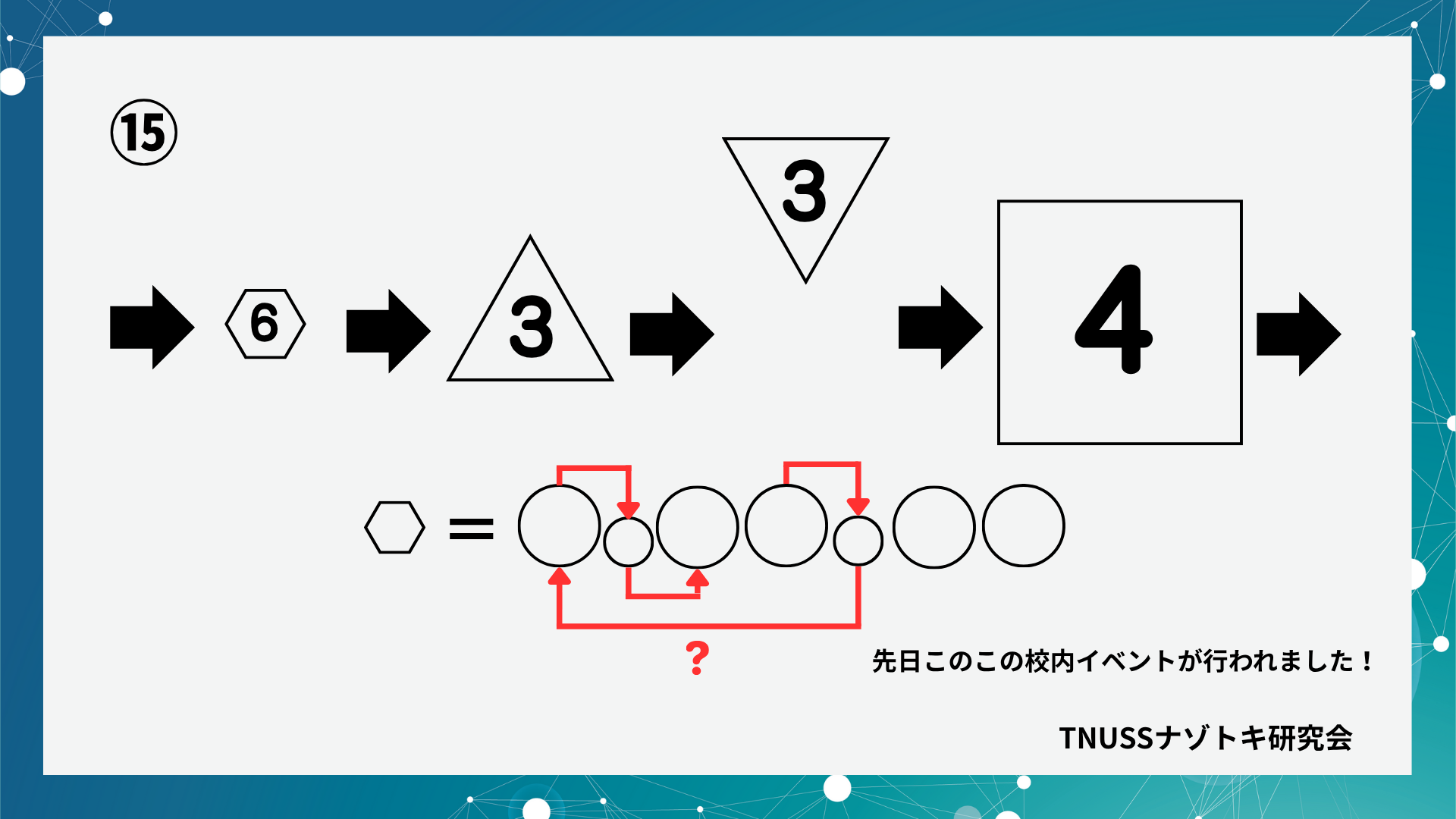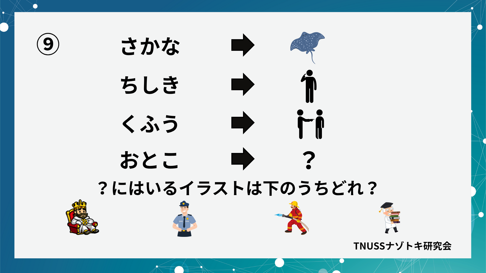 これまで毎週土曜日にSNSで公開していた謎解き問題を一挙に掲載します。本校のTNUSSナゾトキ研究会が作成した問題にチャレンジしてみてください。
