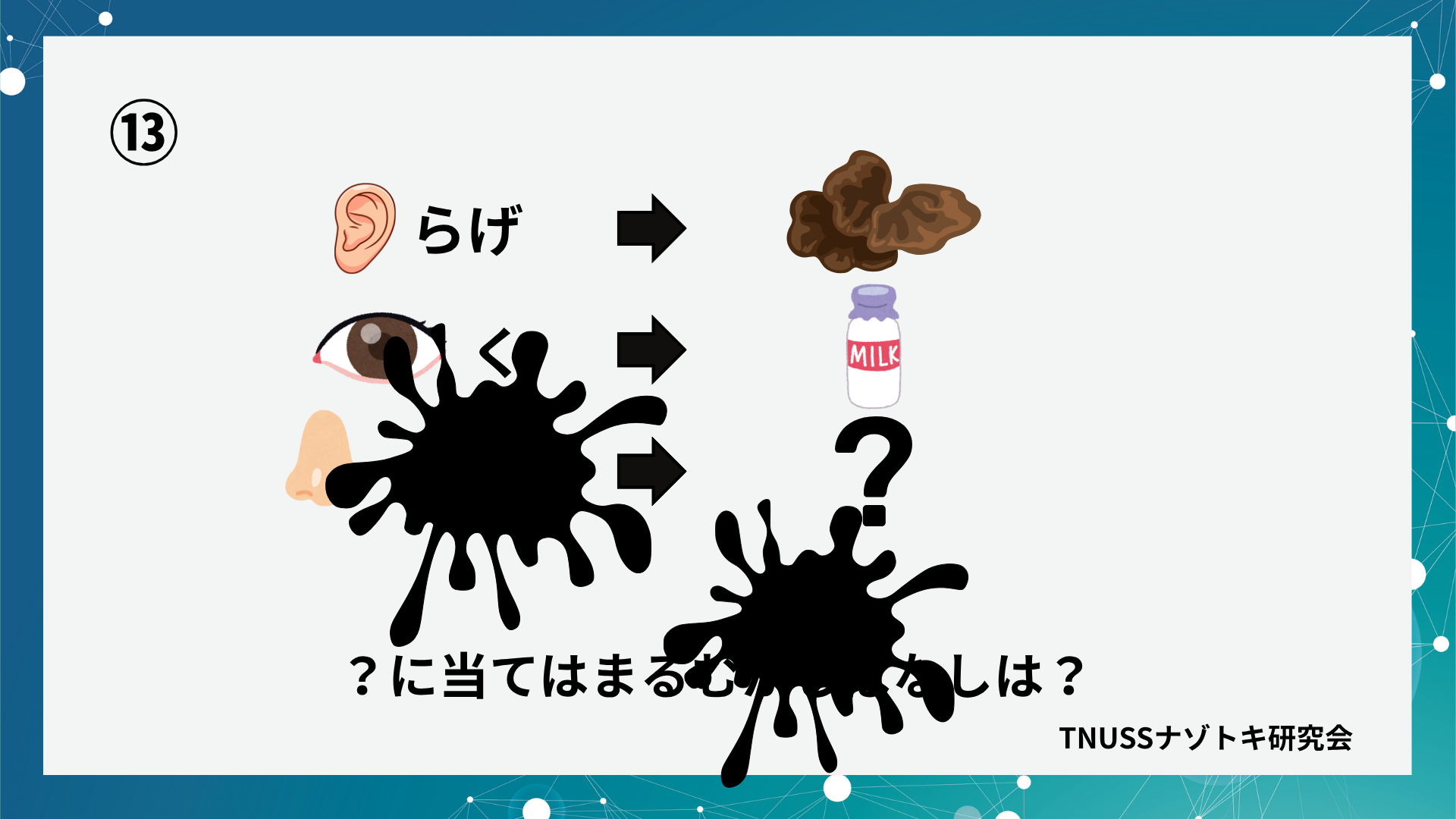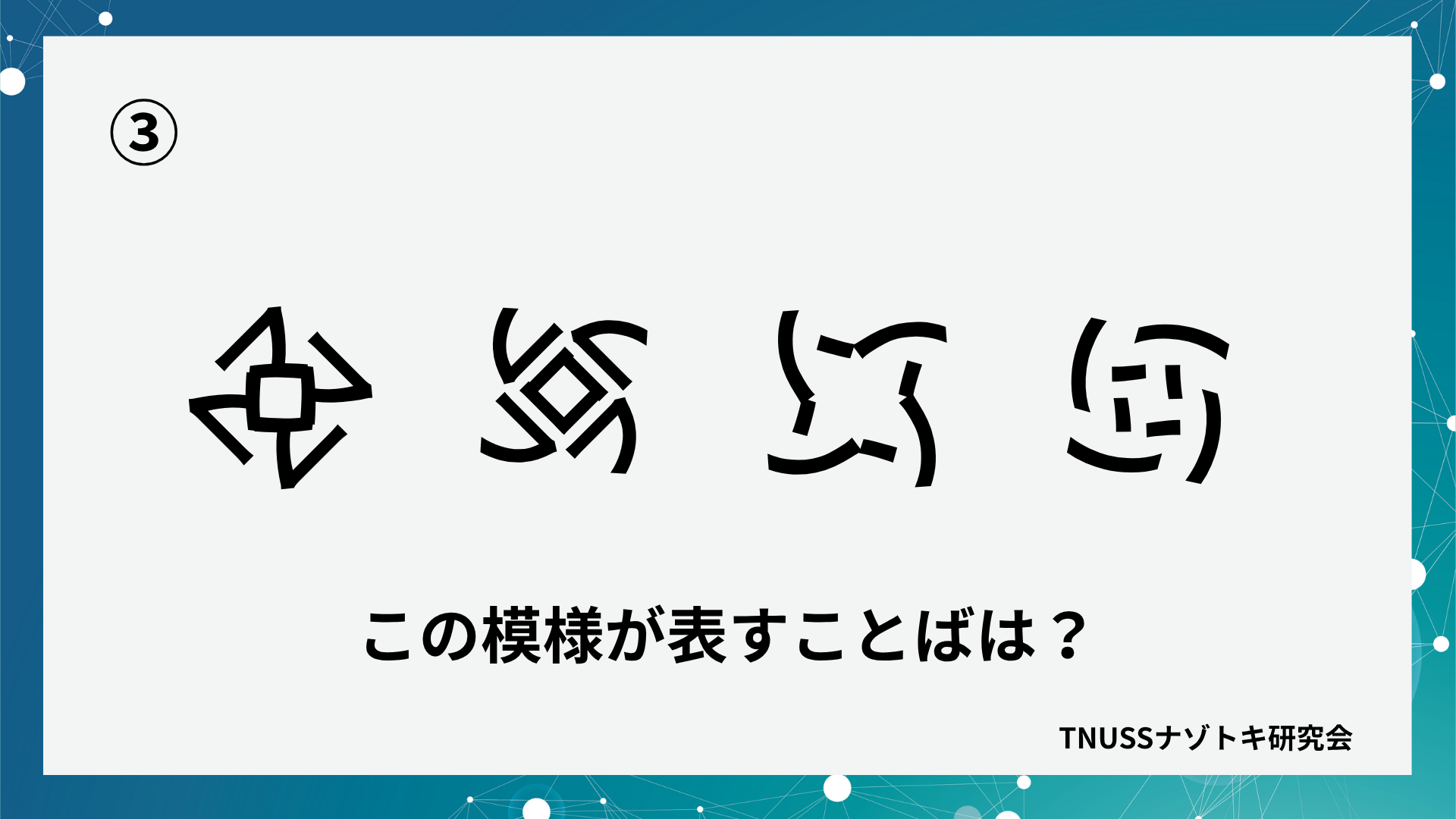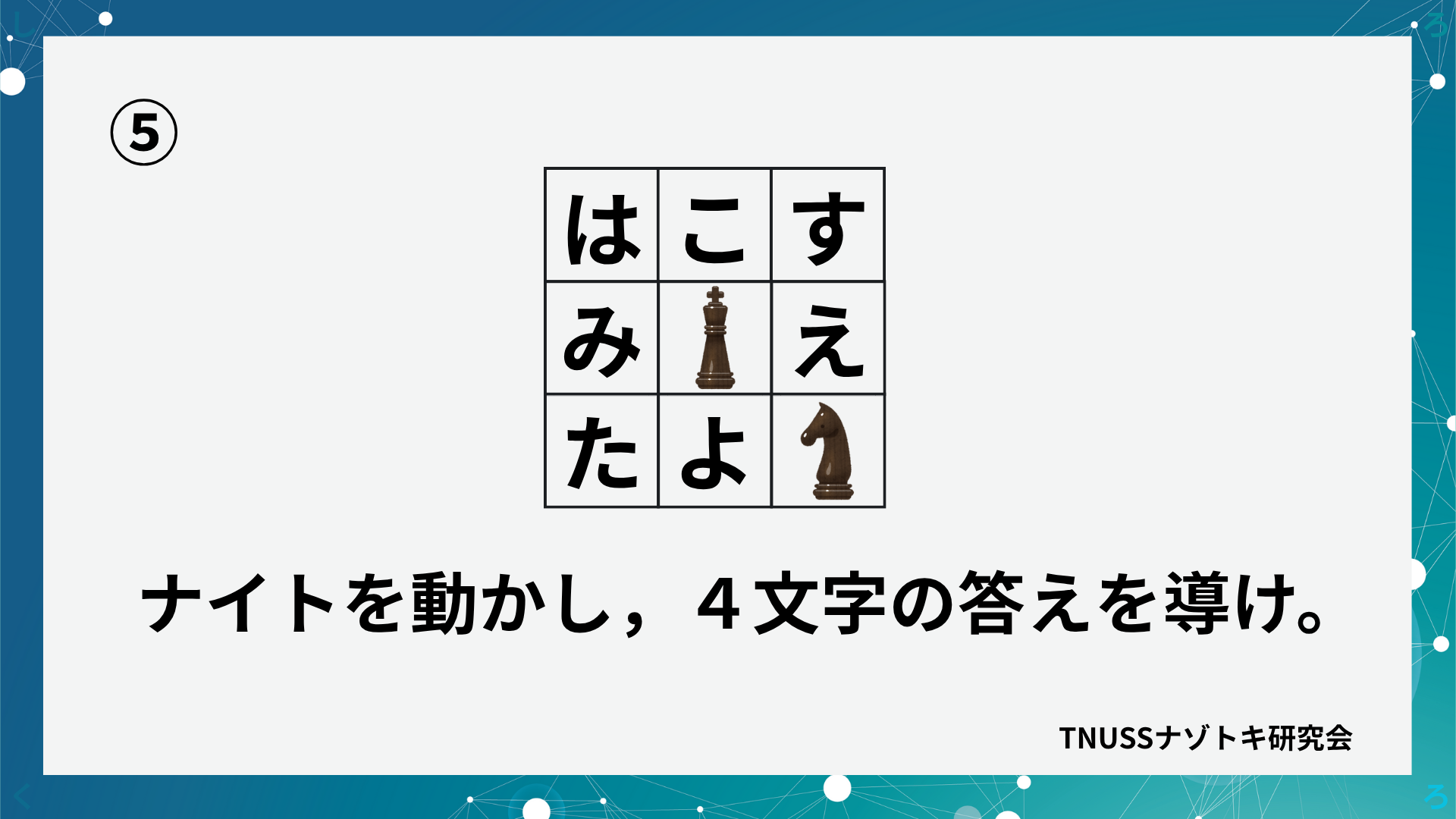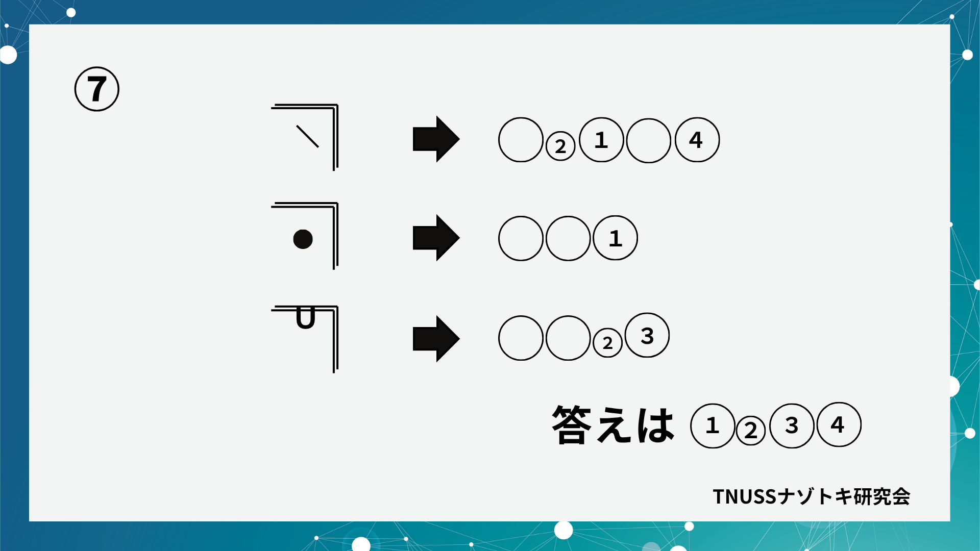 これまで毎週土曜日にSNSで公開していた謎解き問題を一挙に掲載します。本校のTNUSSナゾトキ研究会が作成した問題にチャレンジしてみてください。