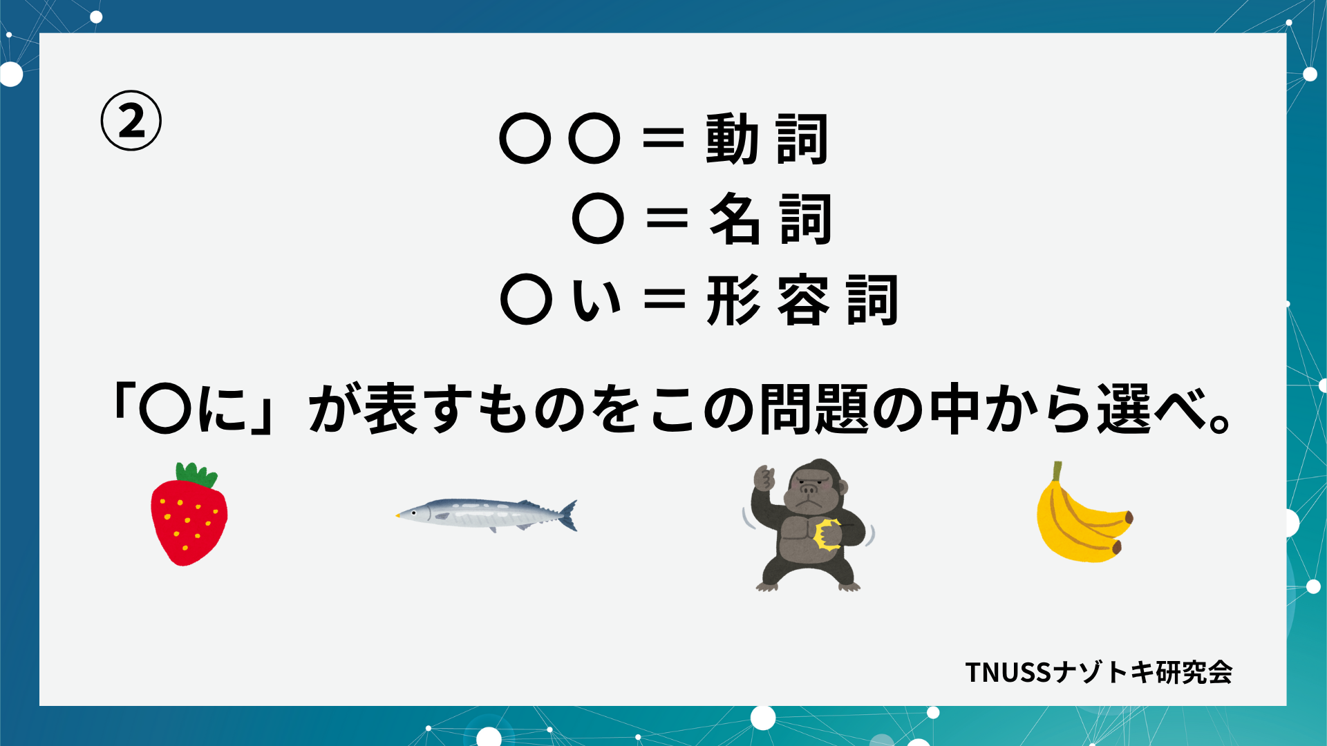 〇には文字が入るわけではなく,〇のまま考えるのが良いでしょう。しかし,そうなった場合,いちごもさんまもゴリラもバナナも「〇に」が表すイラストになりません。問題をよく読んでみましょう。探す範囲は"この問題の中"です。