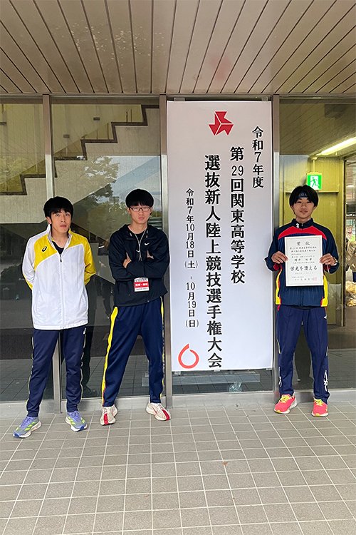 令和7年度第29回関東高等学校選抜新人陸上競技選手権大会が10月18日(土)・19日(日)に山梨県小瀬スポーツ公園でおこなわれました。男子800m・1500mの2種目に出場した大関一星は,ハイレベルなレースにも積極的に挑み,来シーズンへ繋がる走りをしてくれました。男子5000mに出場した,柳晴也は,初めての大きな舞台でも自分のペースでレースを展開することができました。同じく男子5000mに出場した櫻井裕夢は,最初から最後まで1位を譲らず,貫禄の走りで見事優勝することができました。今後の活躍にもぜひご期待ください。