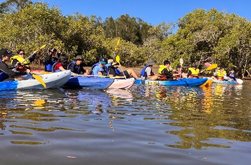 South Wales州にあるTasman Holiday Parksでは海洋環境学習とカヤックを漕いでのマングローブ探検調査を行いました。Queensland州のゴールドコーストにある中等教育学校に場所を移してからは9日間の寮生活を体験しました。学校内外でオーストラリアの歴史・文化とアボリジナルアート/音楽や動植物について学びました。コアラやカンガルーにも触れる機会があり,生徒たちは大興奮でした。また進路学習の一環としてQueenslasnd大学のキャンパスツアーを行いました。ブリスベン港からフェリーに乗って行ったモートン島では,海洋生物や砂でできた島の形成過程,エコツーリズムについて学びました。またイルカの餌付けや砂丘でのサンドボーディングにも挑戦しました。