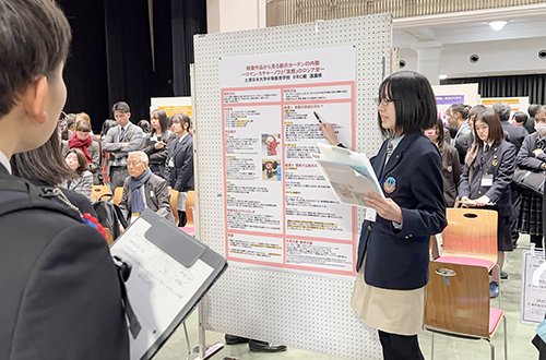 2月18日(水)は基調講演やパネルディスカッションに参加した後,課題研究発表会にてポスターセッションやスライド発表を行いました。生徒たちはこれまでの研究成果について工夫を凝らした発表に取り組みました。2月19日(木)は表彰式が行われ,本校からは遠藤咲さんがポスター発表の人文科学・社会課題分野において優秀賞を受賞しました。生徒たちはこのシンポジウムへの参加で,目標とする進路への意識や興味のある学問分野への探究心の向上へと繋がったようでした。
