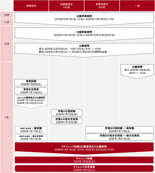 A日程2026年 1月16日(金)10:00 WEB発表 B日程2026年 1月21日(水)10:00 WEB発表 |