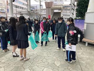 他校生と組み合わせた5つの班に分かれ,駅周辺をきれいに清掃しました。