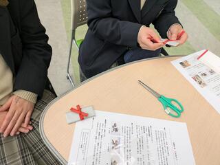 この講座では,東京の紅ミュージアムから講師をお招きし,紅花の歴史や近世社会の化粧文化についてご講義いただきました。 講義の後には,紅体験としてお守り作りを行い,生徒たちにとって貴重な学びと体験の場となりました。