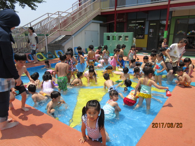 初!プール ①待ちに待ったプールの日!先生たちががプール掃除を済ませ、プールに水を入れ始めると・・・園庭で遊んでいたみんなが、ソワソワ・・・し始めました。「まだかな・・・」と、1人、2人とギャラリーが増え、あっという間にたくさんのお友達がみていました。 |