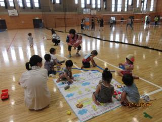 ソフトバレーボール大会 ①日大高校体育館をお借りして、保護者の方々でバレーボール大会を行いました。(希望者) ママたちがバレーボールをしている間、みんなで、遊んで待っています! |