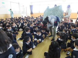 獅子舞① 2019年1月8日、3学期の始業式です。 今年一年の無病息災を願い獅子舞の登場です! 年長さんから頭上を通ってもらいました。 |