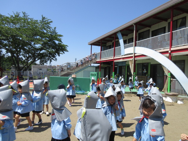 全園児で地震避難訓練を行いました。防災ずきんも上手に被り先生の話をよく聞いて、落ち着いて避難できました。