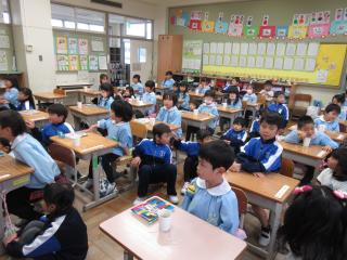 土浦二小の1年生に招待され、年長さん全員で行ってきました。幼稚園とは全く違う雰囲気の中、みんなは少し緊張した様子…。やさしく話しかけてくれるお兄さん、お姉さんと手作りのおもちゃで一緒に遊んできました。そして…卒園児の顔ぶれに懐かしくなるとともに、その成長ぶりに嬉しくなる私たちでした。