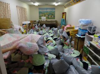今回は竜巻を想定して避難訓練を行いました。なるべく窓の無い場所やトイレに避難をします。おさない、走らない、喋らない、戻らないの「お・は・し・も」で避難をすることが出来ました。