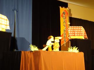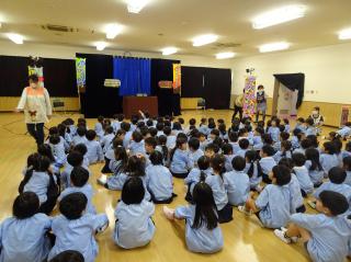 園のホールで、ゆい*パペットシアターの人形劇を見ました!犬のコロちゃんとうさぎのぴょんこちゃんがかくれんぼを楽しむ「なかよし」と、三味線の生演奏を挟みながら物語が進んでいく、三味語り人形芝居「ねずみと小判」のお話でした♪三味線を初めて見たお友達も多く、三味線の音色や音楽に合わせ手拍子をし、楽しみながら人形劇を見ていました!