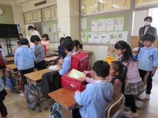 学校ではどんなことをするのか紹介してくれたり、ランドセル体験では、ランドセルを背負わせてもらい、「教科書が入っているともっと重いんだよ!」と優しく教えてくれたお兄さん、お姉さんたちでした♪最後にはメッセージ入りメダルのプレゼントをもらい、嬉しそうにメッセージを読んでいる年長さん達でした♡年長さんももうすぐ小学生!!小学校生活に期待を持てた交流会となりました。