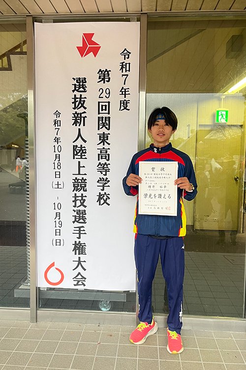 令和7年度第29回関東高等学校選抜新人陸上競技選手権大会が10月18日(土)・19日(日)に山梨県小瀬スポーツ公園でおこなわれました。男子800m・1500mの2種目に出場した大関一星は,ハイレベルなレースにも積極的に挑み,来シーズンへ繋がる走りをしてくれました。男子5000mに出場した,柳晴也は,初めての大きな舞台でも自分のペースでレースを展開することができました。同じく男子5000mに出場した櫻井裕夢は,最初から最後まで1位を譲らず,貫禄の走りで見事優勝することができました。今後の活躍にもぜひご期待ください。
