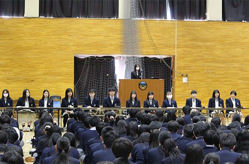 3月16日(月)5時間目に,全校生徒が第2アリーナに集まり生徒総会を実施しました。