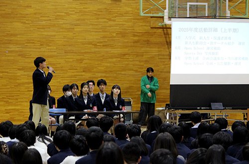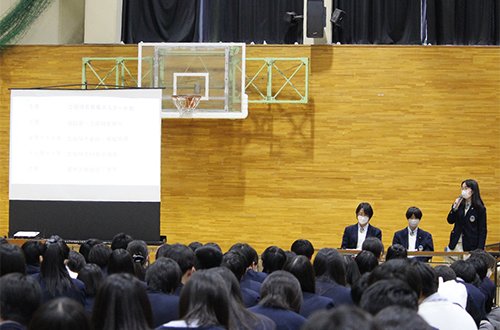 生徒会長からのあいさつの後,生徒会活動報告および各委員会活動報告が行われ,これまでの取り組みや成果,今後の活動について全校で共有しました。各委員会の発表では,それぞれの役割や日頃の活動内容が具体的に示され,生徒一人ひとりが学校生活を支える仕組みについて理解を深める機会となりました。また,生徒会本部より,NU祭準備委員会の活動内容を受け,名称変更の提案がありました。
