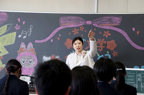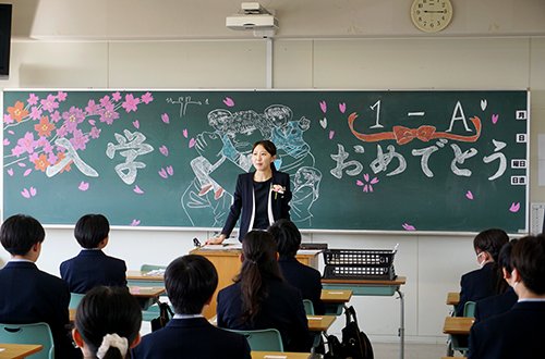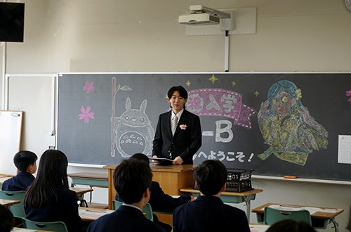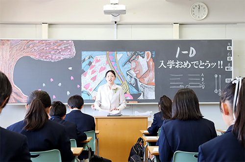 入学式後の学級開きでは,初めて入る教室で,担任の先生の言葉を真剣なまなざしで聞く新入生たちの姿が非常に印象的でした。在校生が心を込めて描いた黒板アートの前で記念撮影を行うなど,各クラスとも和やかで希望に満ちたスタートを切ることができました。