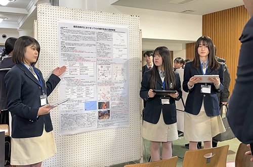 2月18日(水)は基調講演やパネルディスカッションに参加した後,課題研究発表会にてポスターセッションやスライド発表を行いました。生徒たちはこれまでの研究成果について工夫を凝らした発表に取り組みました。2月19日(木)は表彰式が行われ,本校からは遠藤咲さんがポスター発表の人文科学・社会課題分野において優秀賞を受賞しました。生徒たちはこのシンポジウムへの参加で,目標とする進路への意識や興味のある学問分野への探究心の向上へと繋がったようでした。