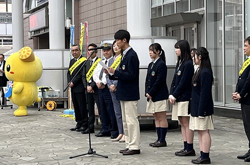 令和8年度春の全国交通安全運動街頭キャンペーンに協力校として生徒会のメンバーが参加しました。4月1日から始まった自転車の交通反則通告制度,いわゆる「青切符」の周知やスマートフォンを利用しながらの「ながら運転」などに注意をして,交通事故のない安全な社会づくりに貢献したいと,5年生の白川さんが堂々と交通安全宣言を述べました。その後は土浦駅周辺において,土浦市長や土浦警察署の方々と共に,通行する方に交通安全の呼びかけを行いました。自転車利用者だけでなく,全ての人が交通安全の意識を高めていけるように,学校においても注意喚起を促していきたいと思います。