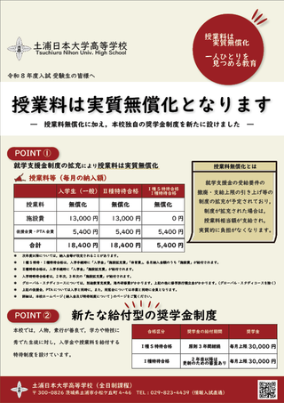 - また,本校の特待制度により「学力Ⅰ種S特待」「Ⅰ種特待(学力/スポーツ/GS)」合格者は,毎月30,000円を上限に奨学金を給付します。