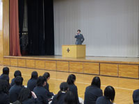 | 学校長から東日本大震災を踏まえての講話がありました。人間は何事にも克服する術を持っており,経験を通して後に繋げていくという話でした。 |