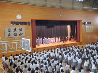 また,吉田校長・父母と教師の会の説田会長・三河生徒会長それぞれから激励の言葉がかけられ,選手からは,バスケットボール部主将の川崎さんと硬式野球部主将の鈴木君から代表挨拶の中で大会への意気込みが述べられました。