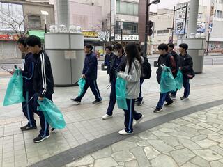 他校生と組み合わせた5つの班に分かれ,駅周辺をきれいに清掃しました。